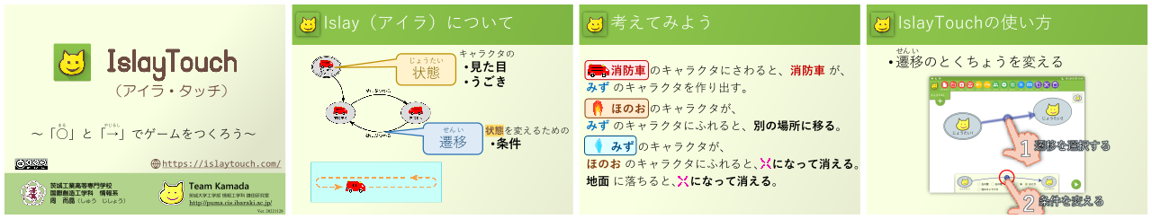 Islay(アイラ)は茨城大学で開発された状態遷移図に基づいたビジュアルプログラミング言語です。 2005年に最初のPC版(右の図)が公開され、その後、3Dアニメーションの作成に対応したバージョンやブラウザ上で手軽に使えるWeb版など、様々なバリエーションが開発されています。
