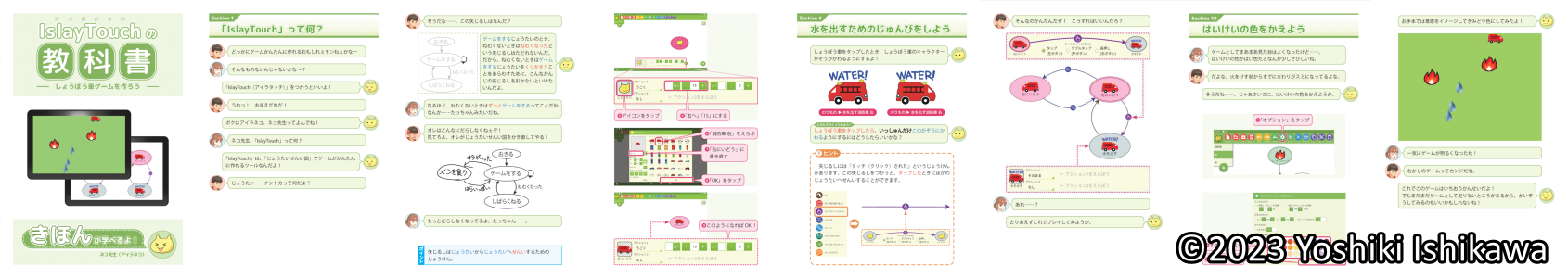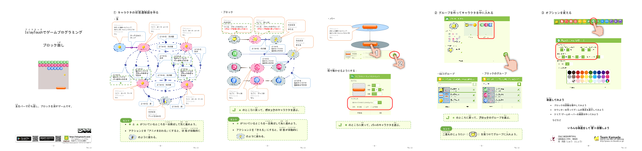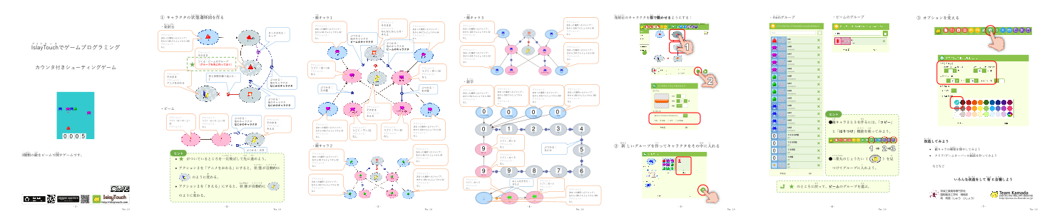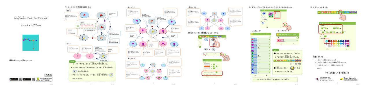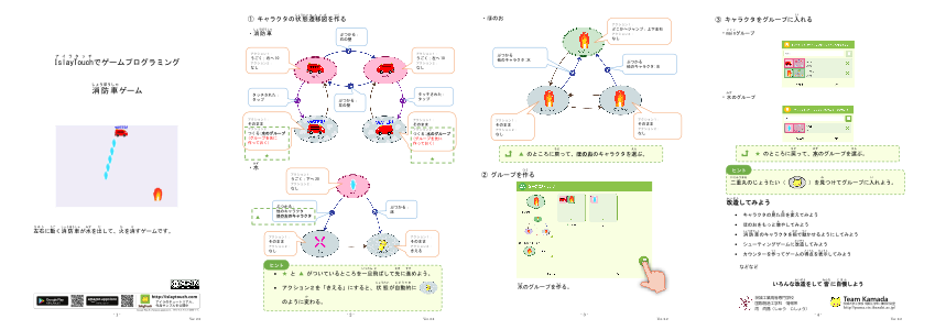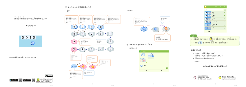 「○」と「→」で状態遷移図を書いてキャラクタのうごきを決めましょう。 あなたの設計図どおりにキャラクタたちが動き出します。 キャラクタの種類を増やしたり、見た目を変えたりして、工夫しだいでいろんなゲームが作れます。